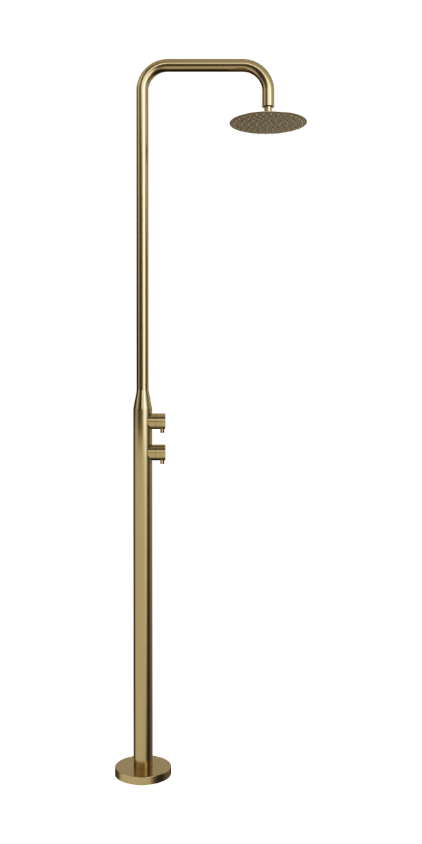Finished in a refined brushed gold, this premium outdoor shower brings architectural elegance while standing up to salt air, chlorine, and harsh weather.